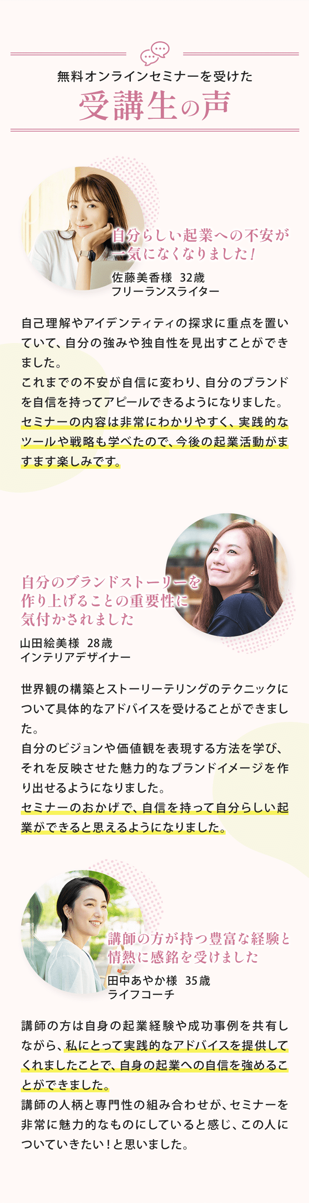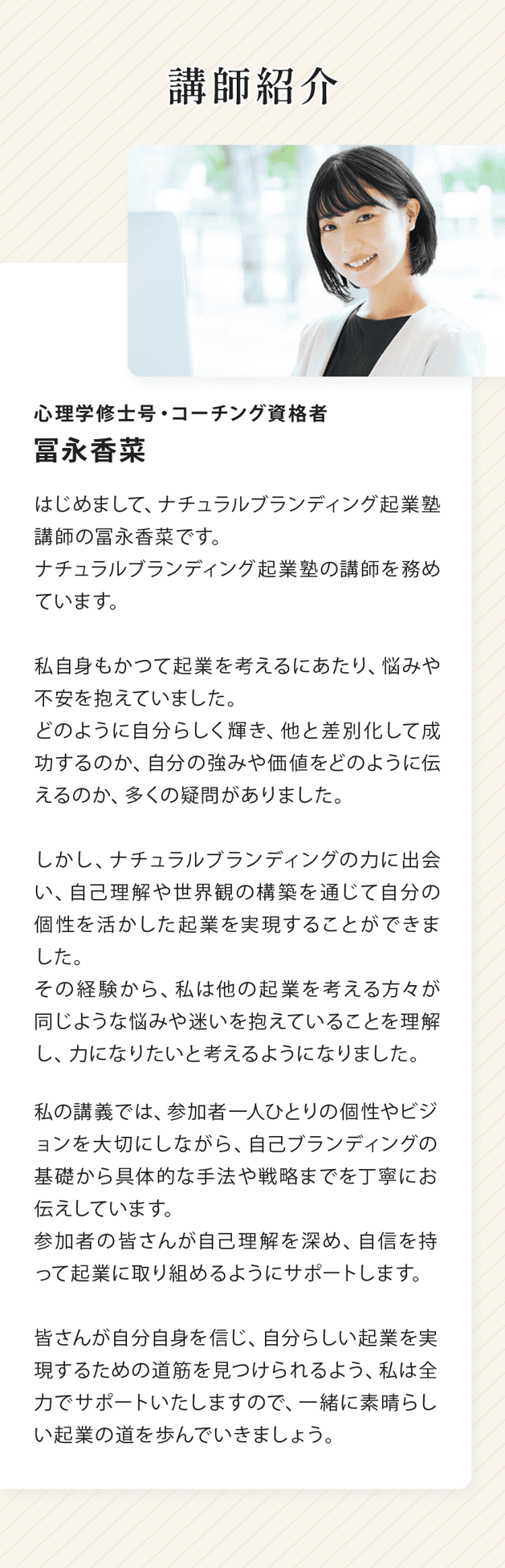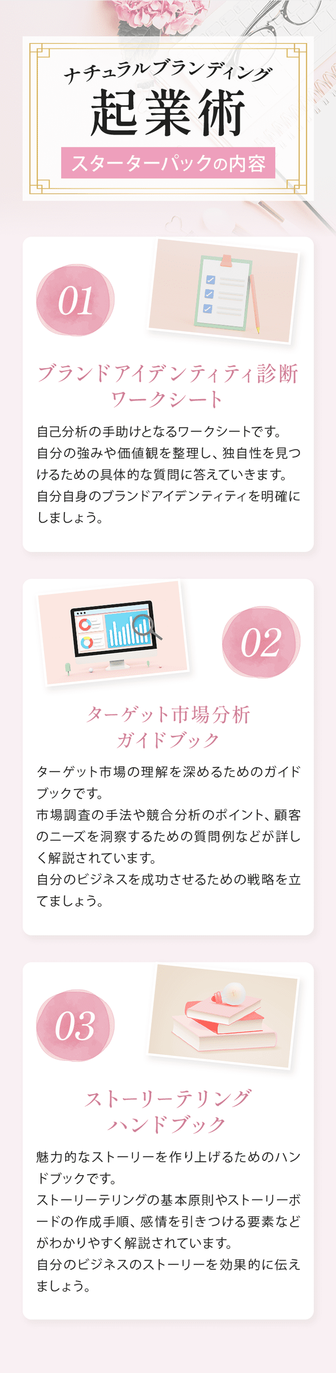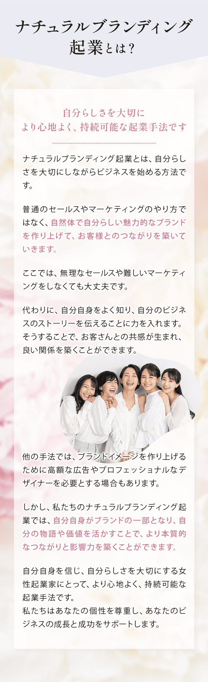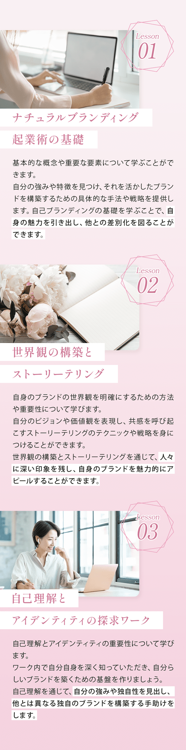 自己ブランディングの基礎を学び、自分らしい世界観を構築し、魅力的なストーリーテリングを身につけることができます。